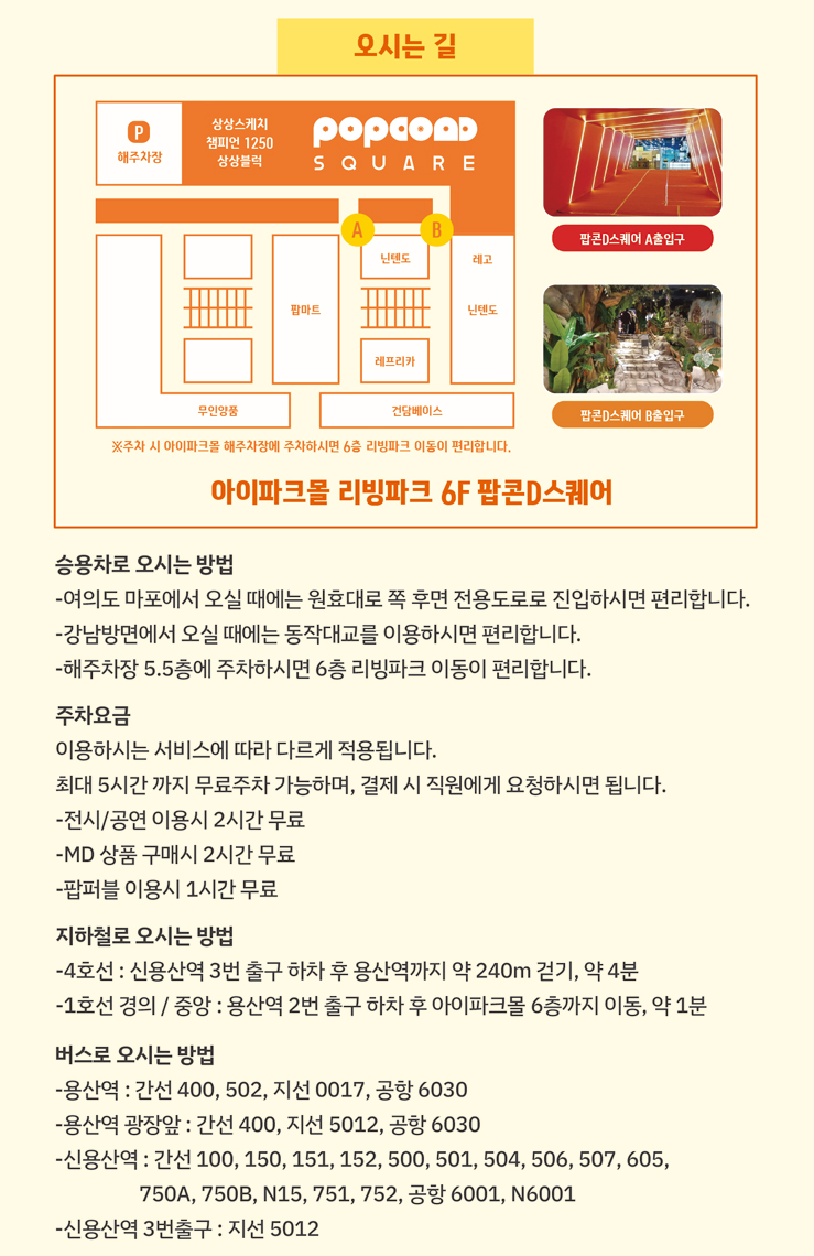 - 1호선 경의/중앙선 용산역 2번 출구 → 아이파크몰 6층까지 약 1분 소요